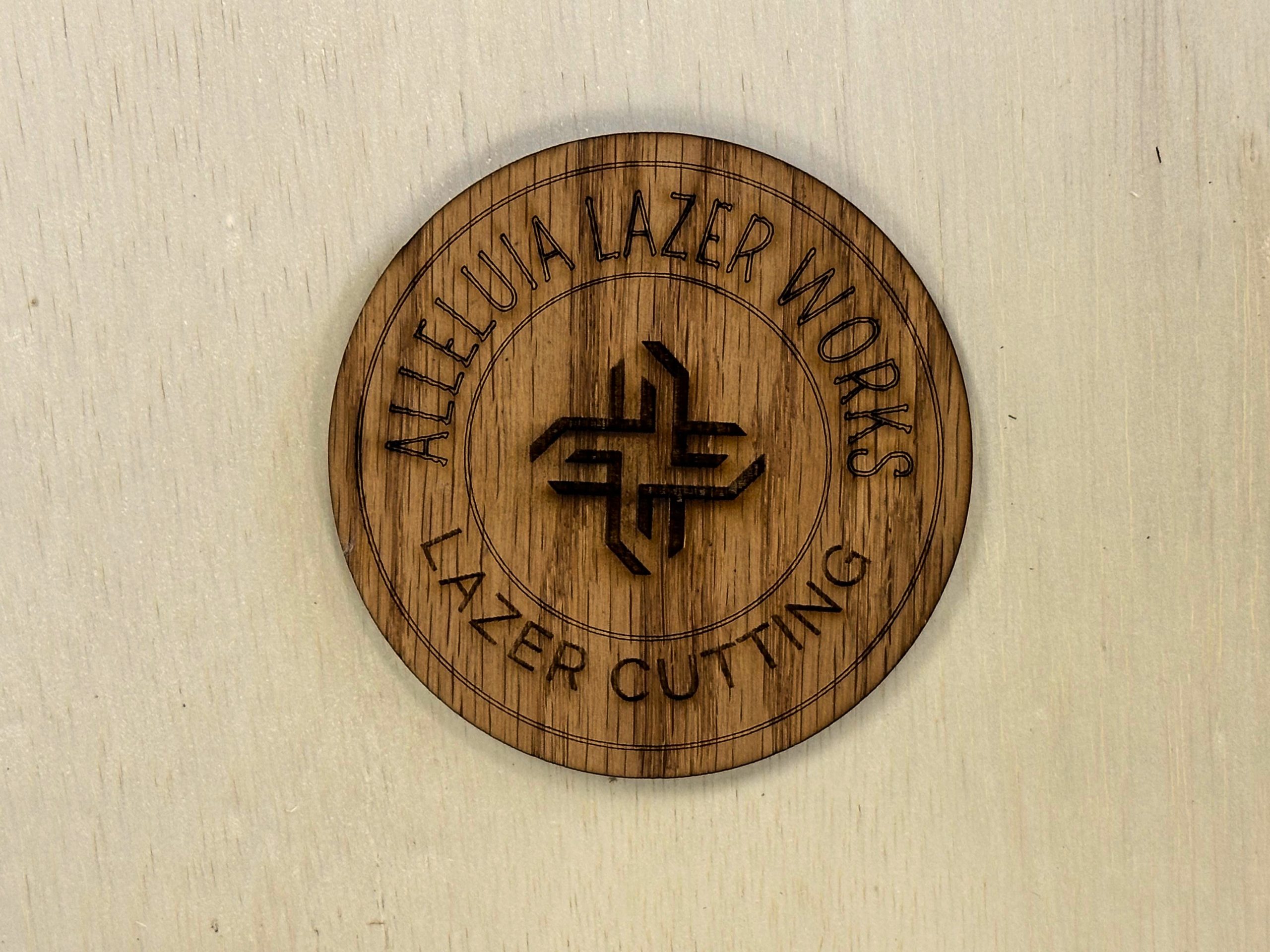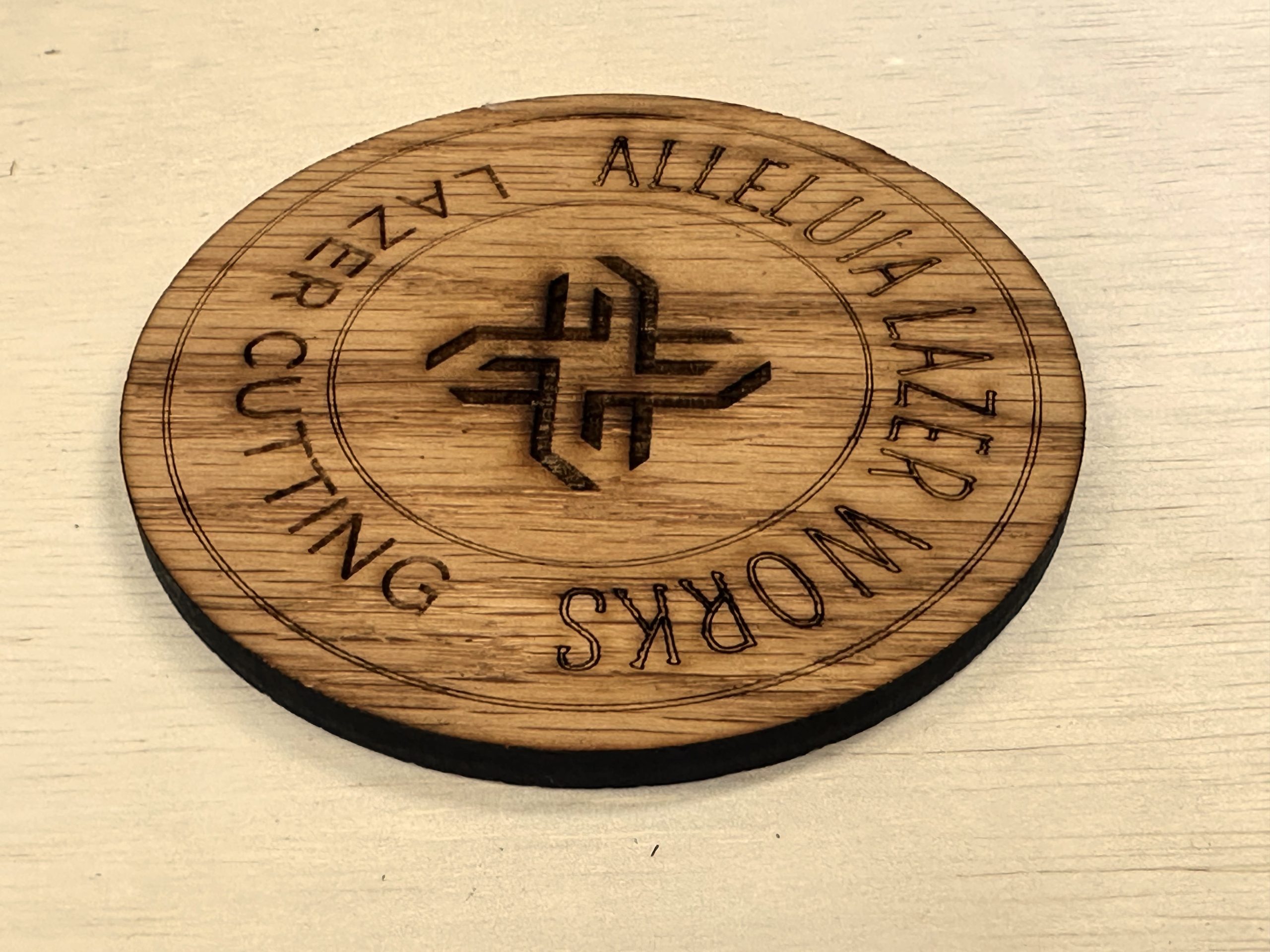 A special wooden coaster with the Alleluia Lazer Works logo on it.
